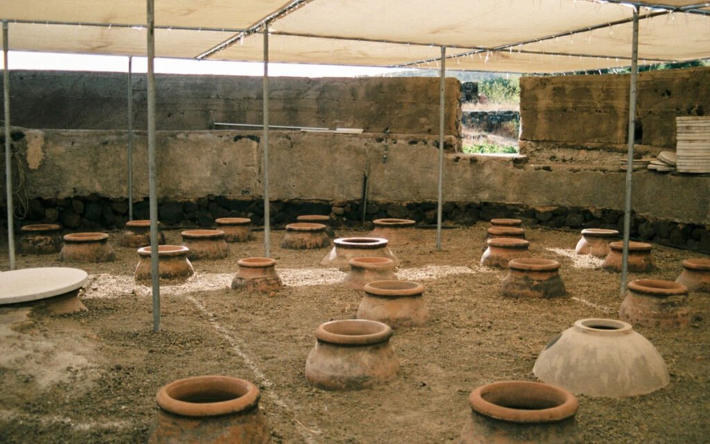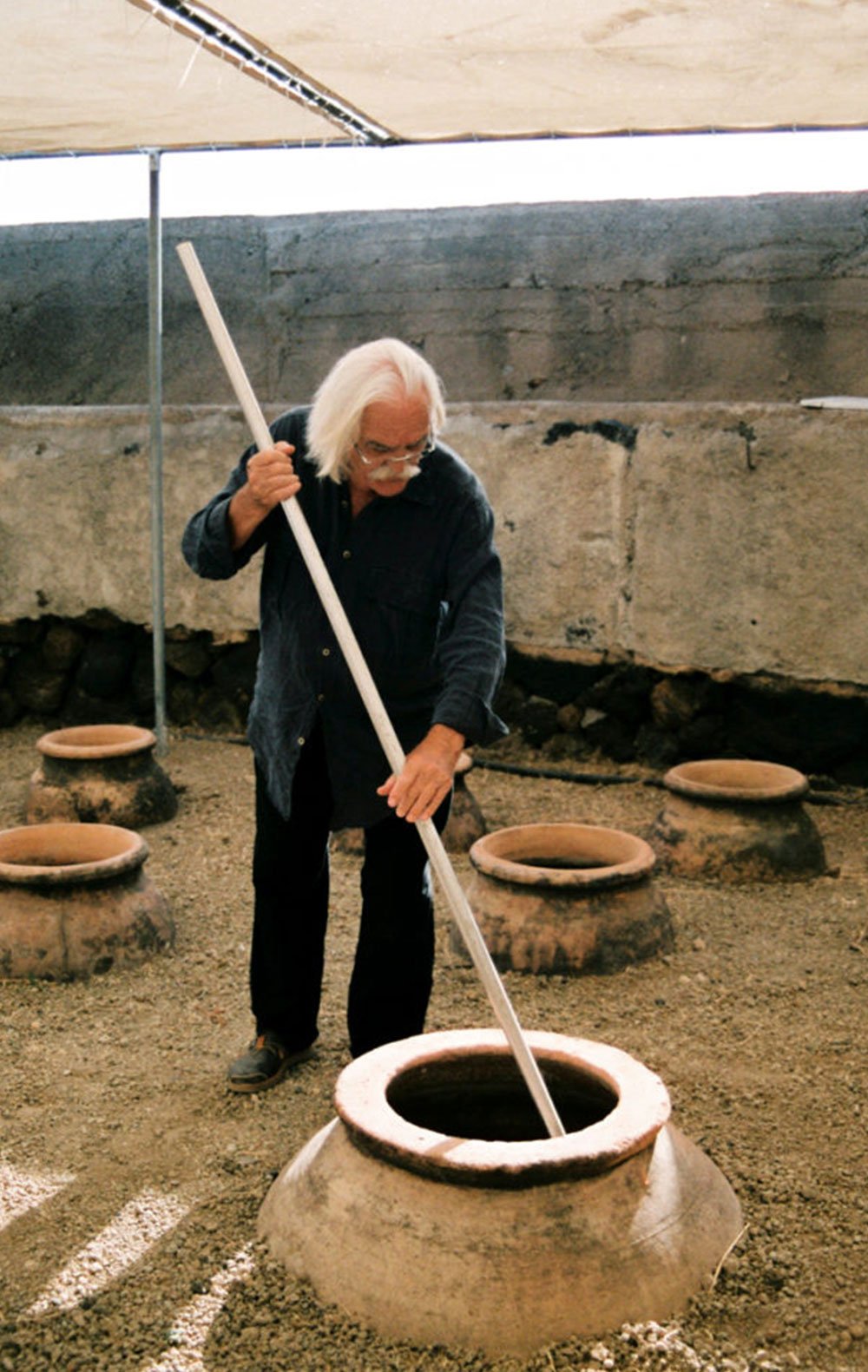 Todos sus vinos pasan por una larga maceración con los hollejos y se conservan en ánforas de terracota enterradas en el viñedo.
